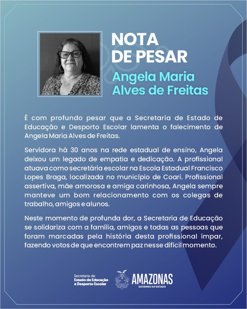 Servidora dedicada por 30 anos na rede estadual de ensino, Angela deixou um legado de empatia e comprometimento. Atuava como secretária escolar na Escola Estadual Francisco Lopes Braga, situada no município de Coari. Com sua determinação profissional, sua ternura como mãe e sua afabilidade como amiga, Angela cultivou relacionamentos harmoniosos com colegas de trabalho, amigos e alunos.